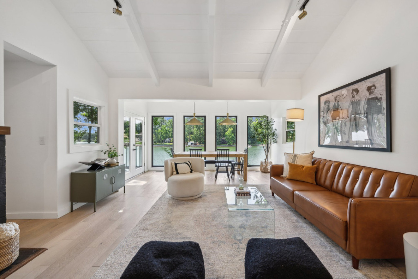 The open concept living room boasts soaring ceilings, large windows overlooking Lake Norman, and a cozy fireplace, creating an inviting atmosphere for relaxation and gathering with loved ones.