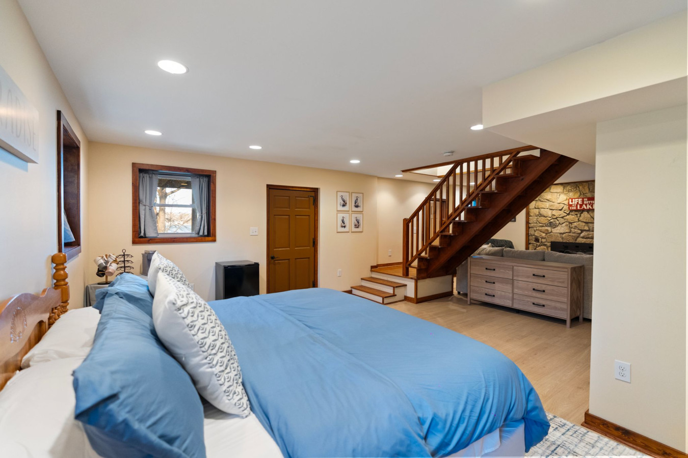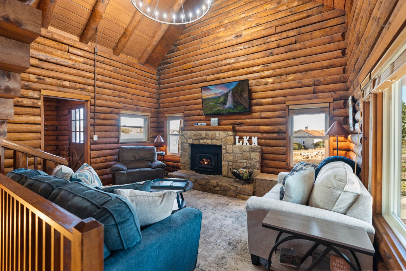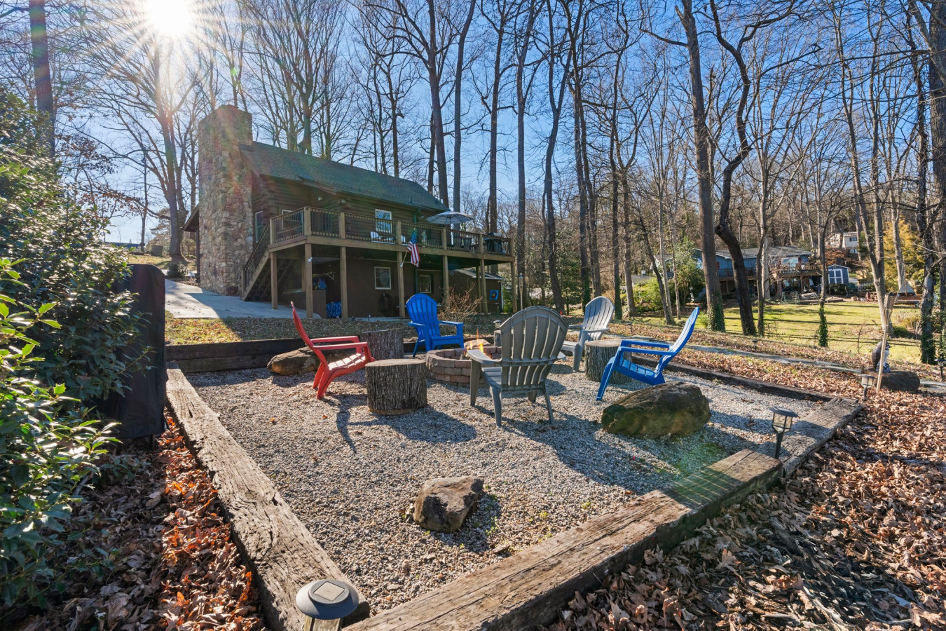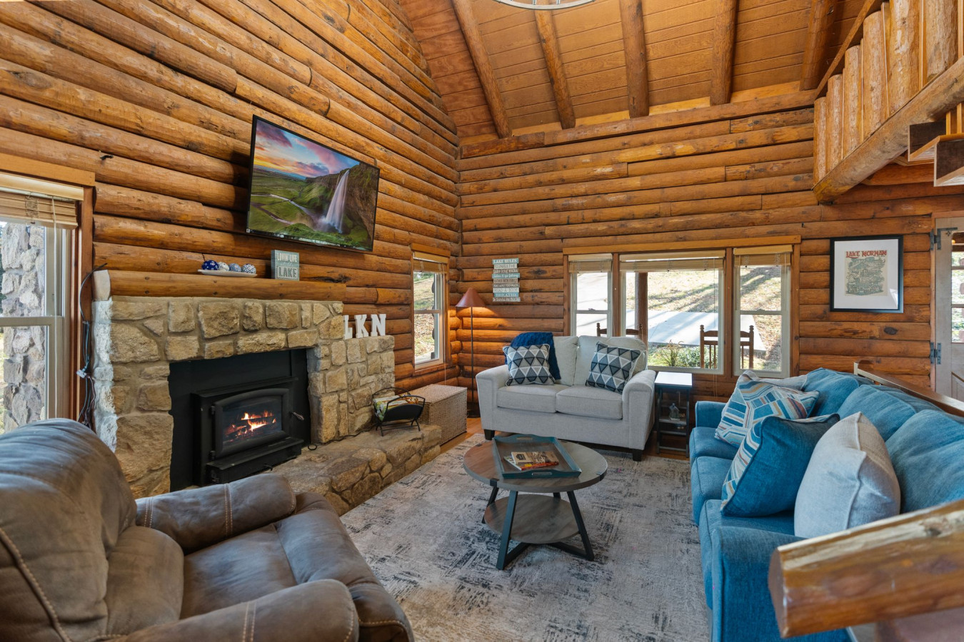 The cabin boasts a cozy floor plan, with rustic wood accents, a cozy stone fireplace, and large windows that allow you to soak in the beautiful lake scenery. The fully equipped kitchen, comfortable living area, and inviting bedrooms ensure a relaxing stay, while the outdoor space provides endless opportunities for fun and relaxation.