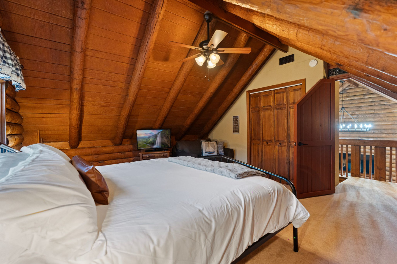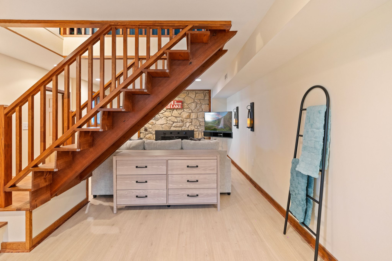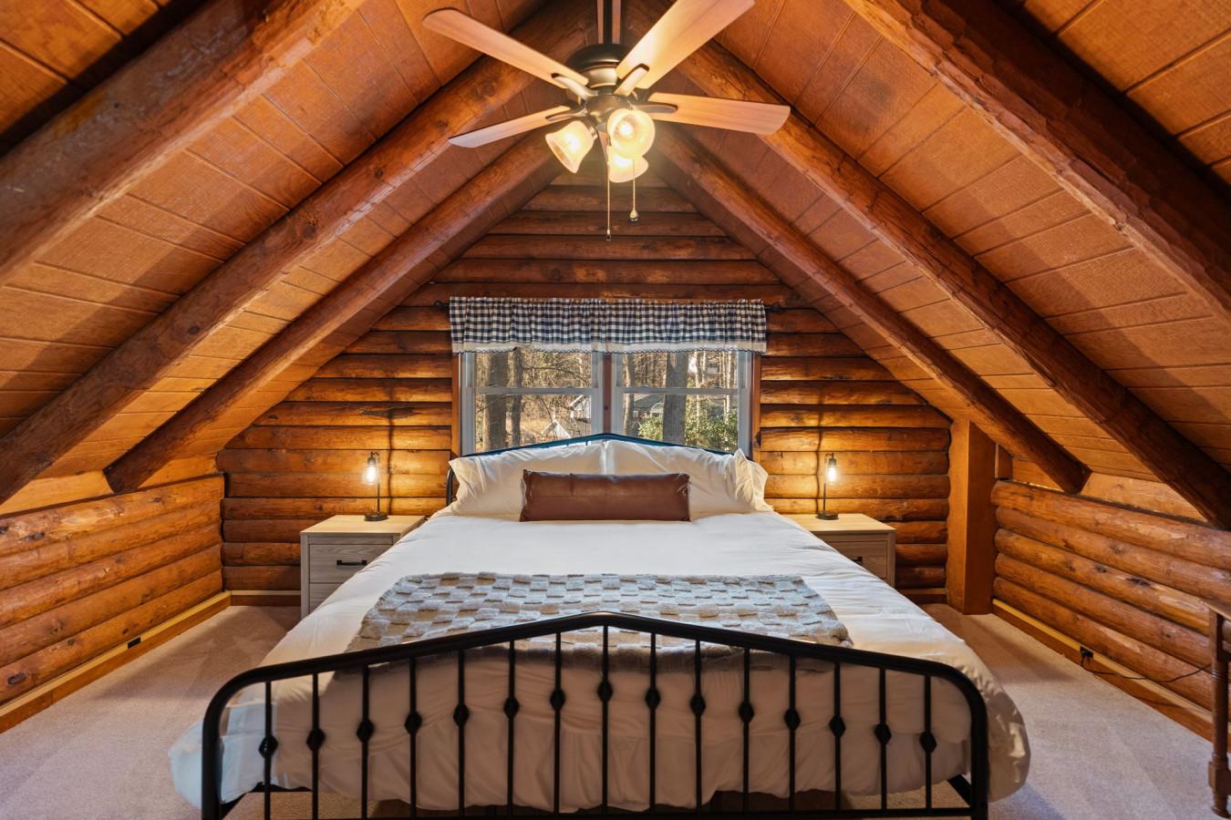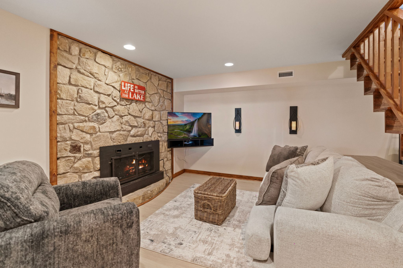 The cabin boasts a cozy floor plan, with rustic wood accents, a cozy stone fireplace, and large windows that allow you to soak in the beautiful lake scenery. The fully equipped kitchen, comfortable living area, and inviting bedrooms ensure a relaxing stay, while the outdoor space provides endless opportunities for fun and relaxation.
